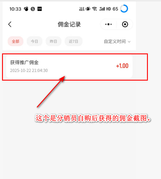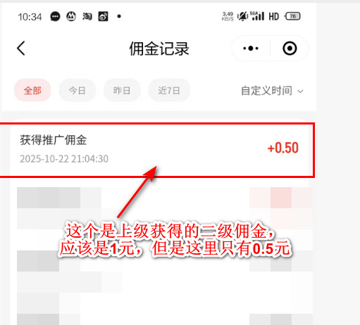 分销员在自己下单购买后,按理应该获得2元的一级返佣;他的上级获得1元的二级返佣;