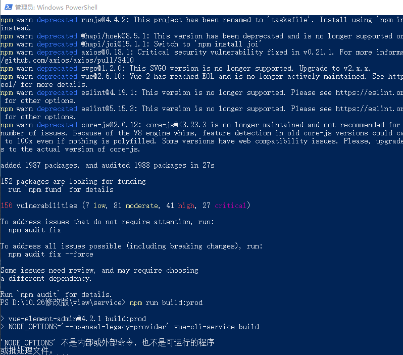 按照这个教程 https://www.crmeb.com/ask/thread/9389 操作 打包 客服后台,执行 npm run build:prod 命令后如下图,打包失败,怎么解决